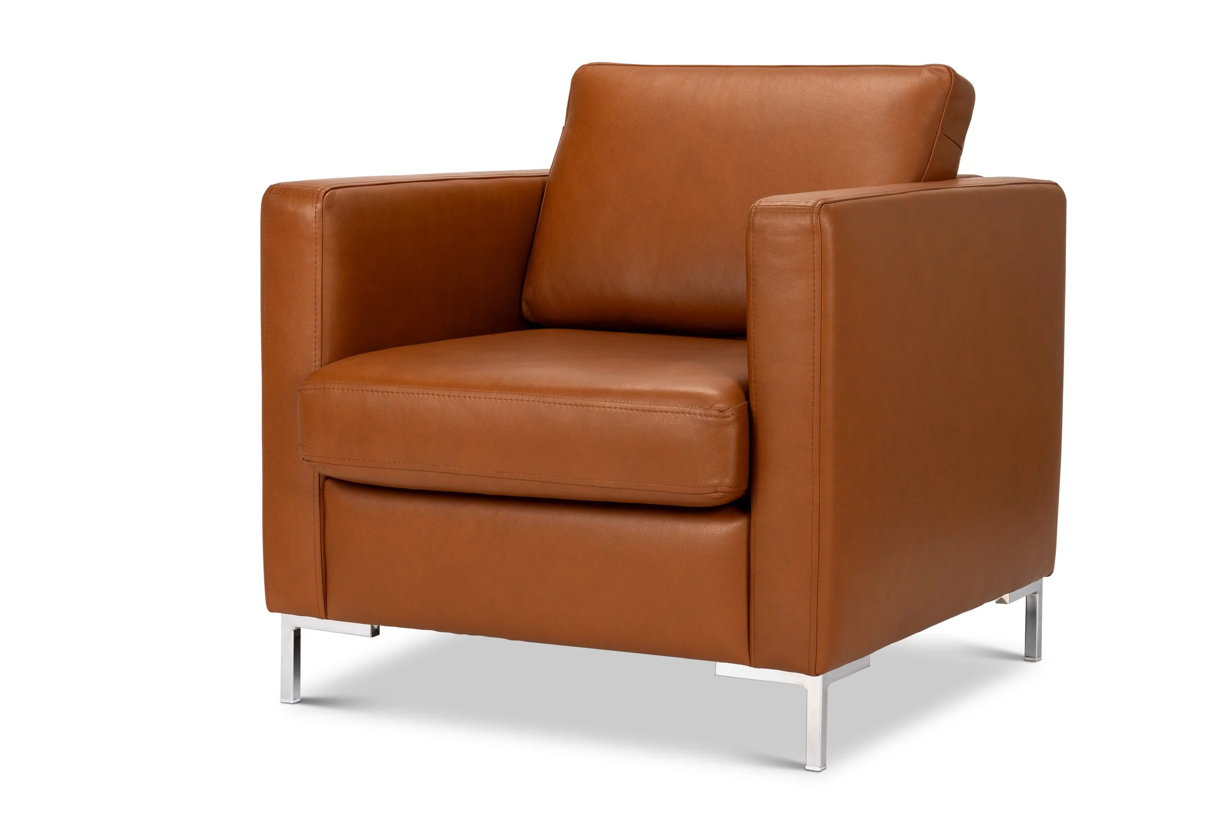 Besonders charakteristisch ist das strenge Chromgestell, das dem Möbel eine moderne, fast schwebende Leichtigkeit verleiht, indem es die geometrischen Lederflächen geschickt in Szene setzt.